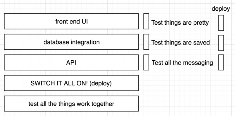 3. Deploy. Why bother deploying incrementally? Cause for most of the time you just spent developing you’ve made something that doesn’t actually do anything. That is, something that doesn’t work until the last minute. And you know what that is? That’s waterfall. That’s what that is. You can see that in the diagram, thats the “test all the things work together” bit.