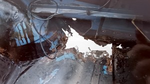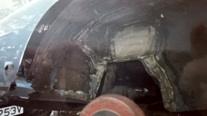 The back corners of the boot floor were a crunchy mess. They must have rusted away years ago and a succession of youthful and well meaning owners (the car had 14 of them!) had ladled glassfibre