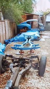 He recommended a small bodywork firm in Coventry to do the work. Accordingly Bluey’s bonnet was secured to a wooden frame and bolted to roof bars on the Escort (a bizarre sight of which I have no photographs) and dispatched to said firm. The job was not cheap, but it was well done, the only minor criticism, revealed many years later when the headlamps were being fitted being that the plates to which the headlamps are fitted were welded out of true and so the cast cowls would not fit over the headlamps. The only solution was to cut the plates, a shame after everything had been painted.